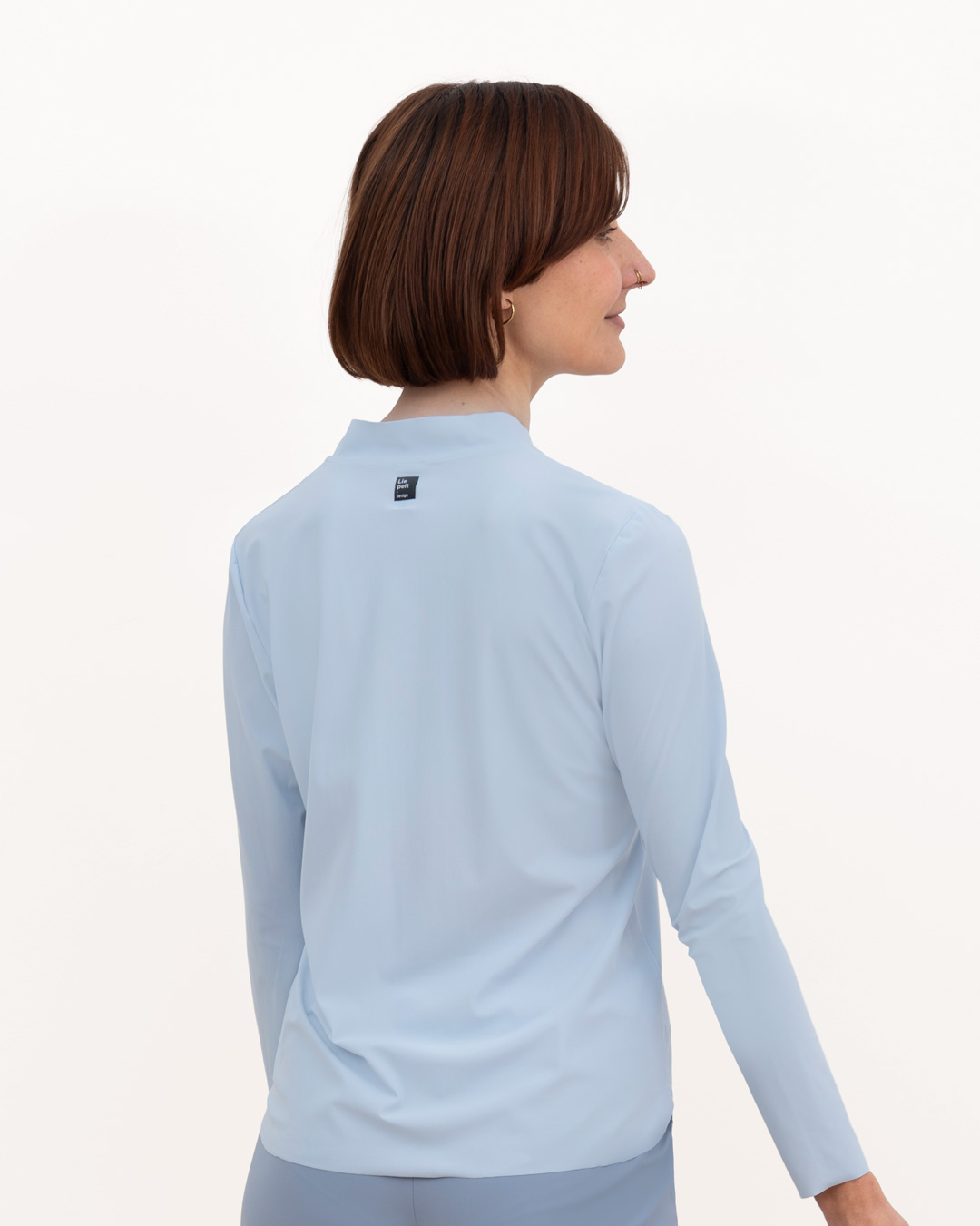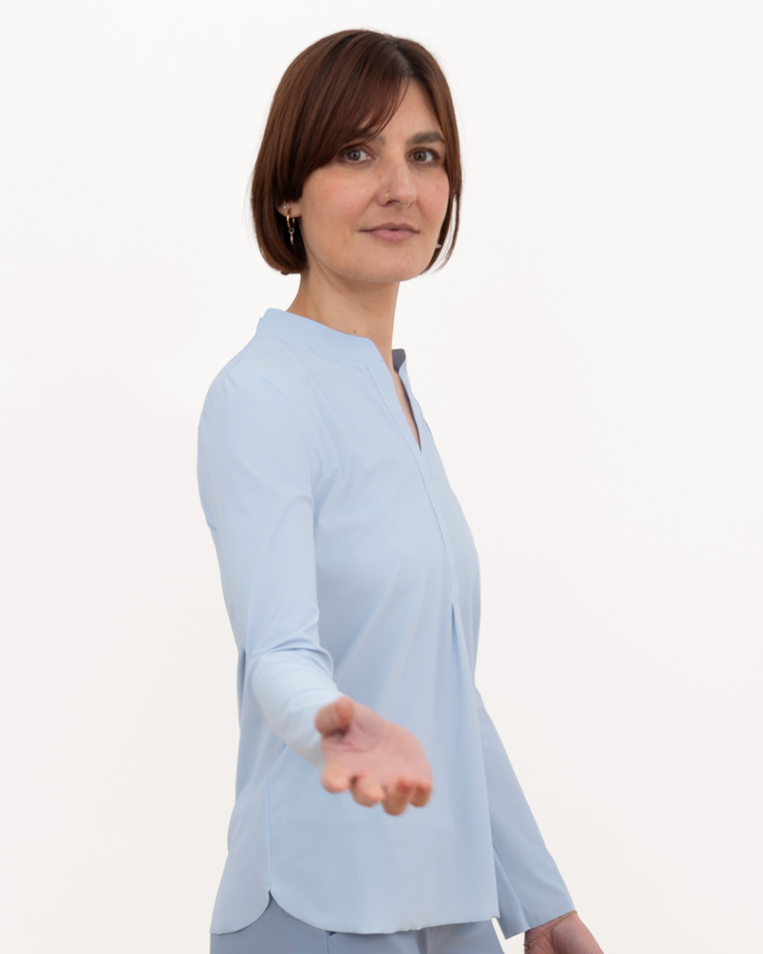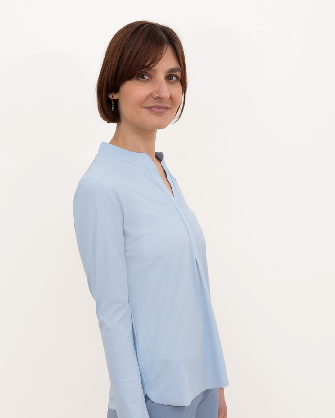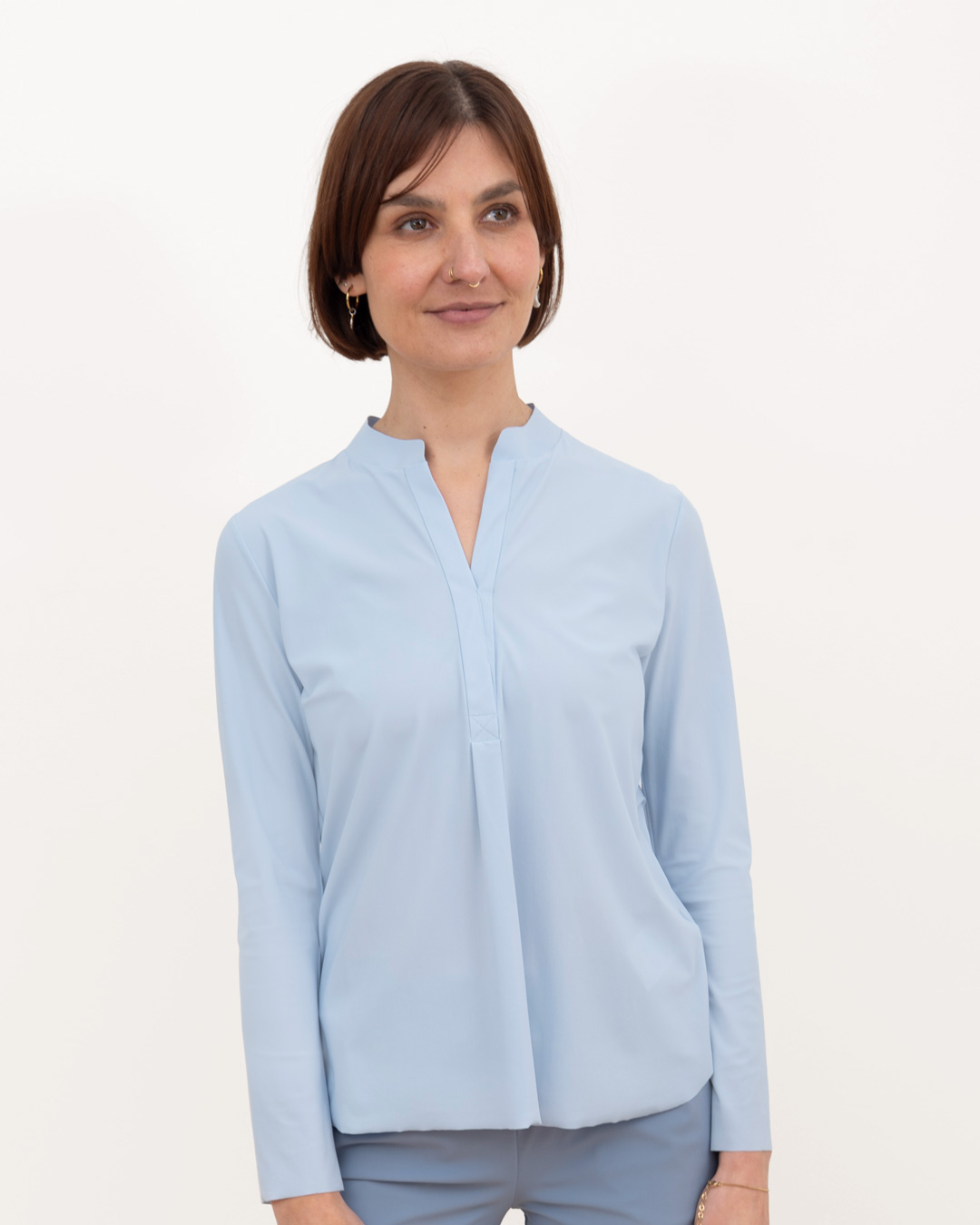 Shirt mit schmalem, halsfernen Stehkragen und überschnittener Schulter. Kellerfalte in vorderer und hinterer Mitte. Lässig weit geschnitten.