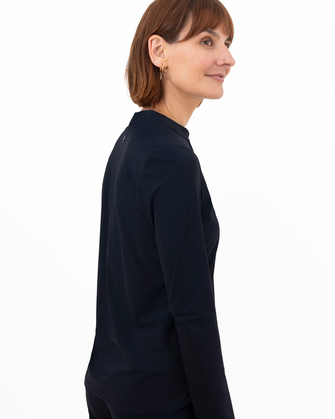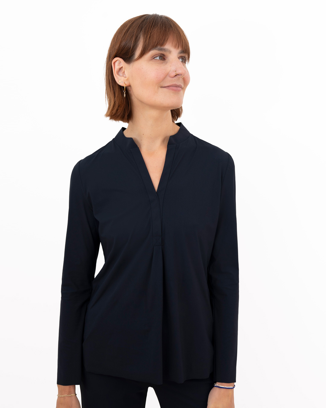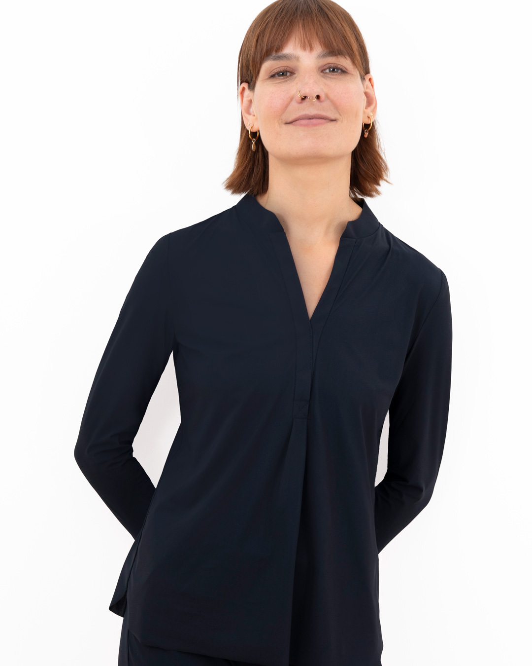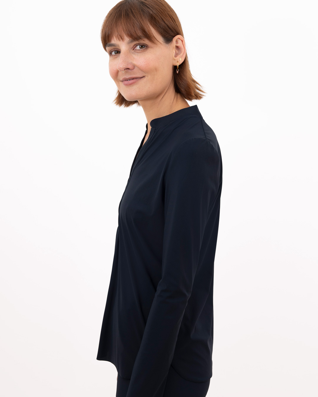 Shirt mit schmalem, halsfernen Stehkragen und überschnittener Schulter. Kellerfalte in vorderer und hinterer Mitte. Lässig weit geschnitten.