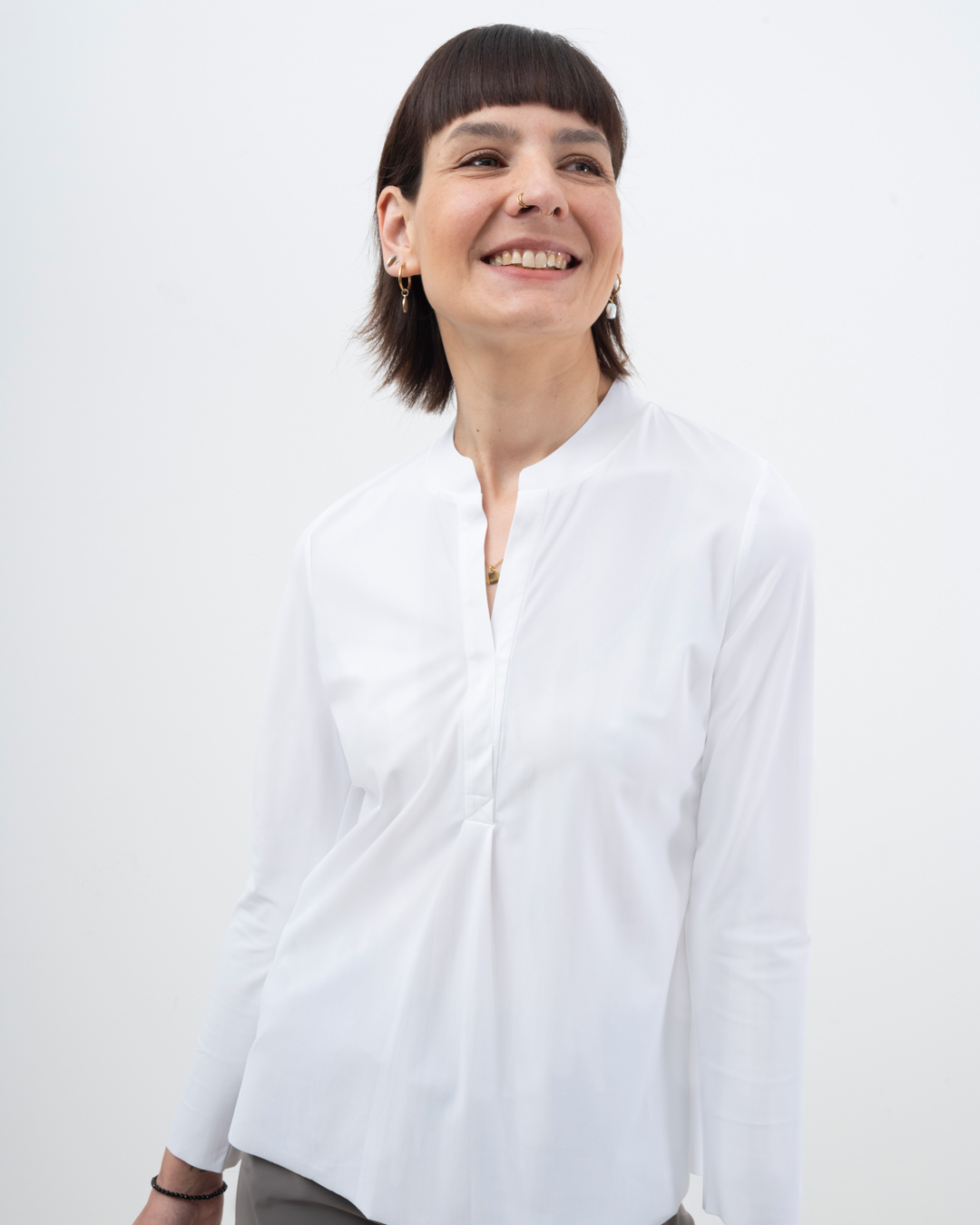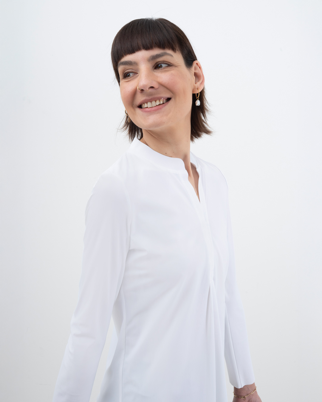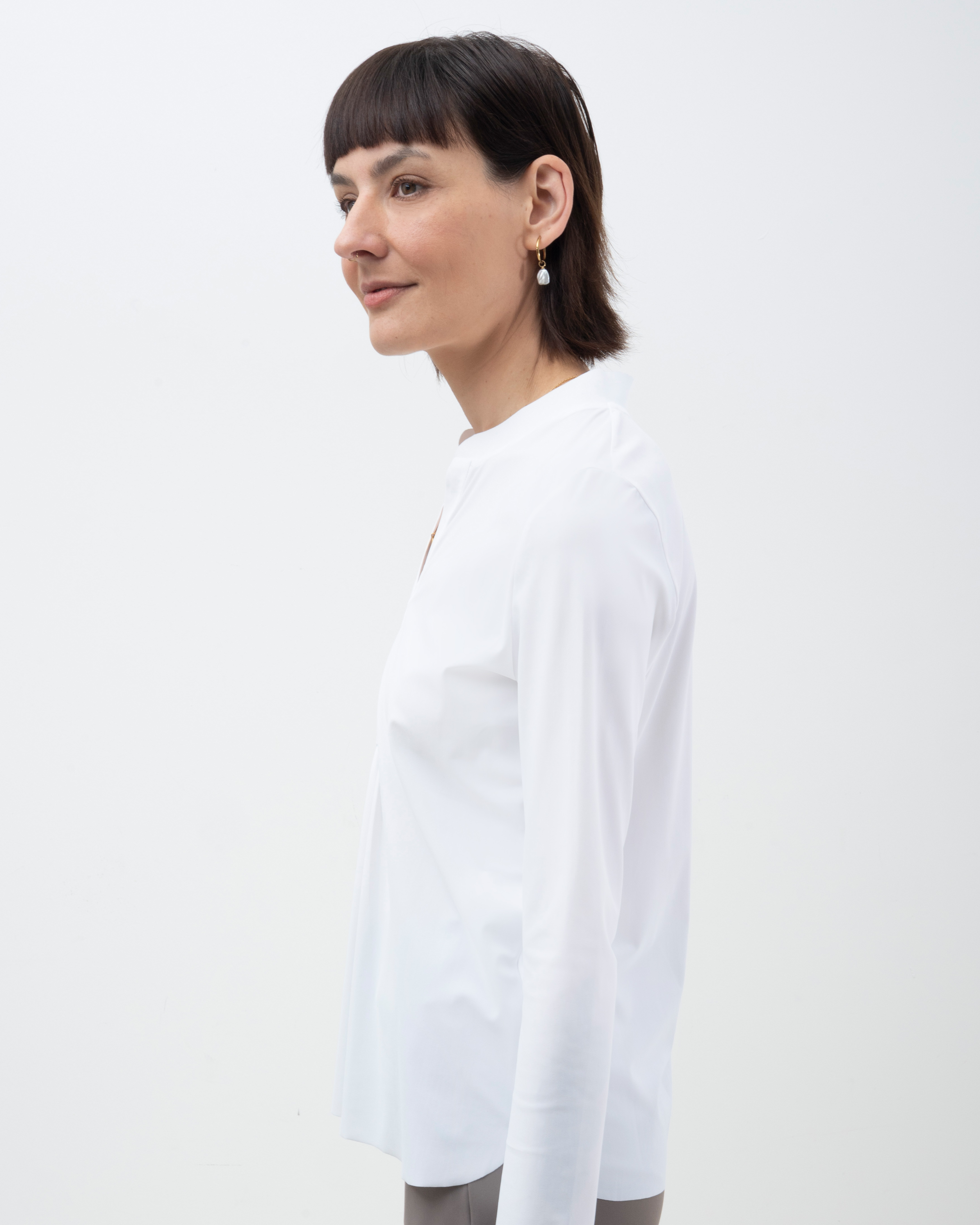 Shirt mit schmalem, halsfernen Stehkragen und überschnittener Schulter. Kellerfalte in vorderer und hinterer Mitte. Lässig weit geschnitten.
